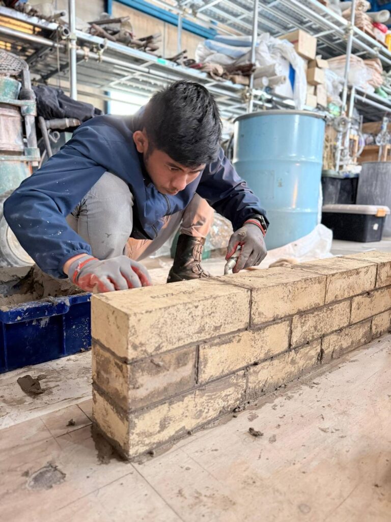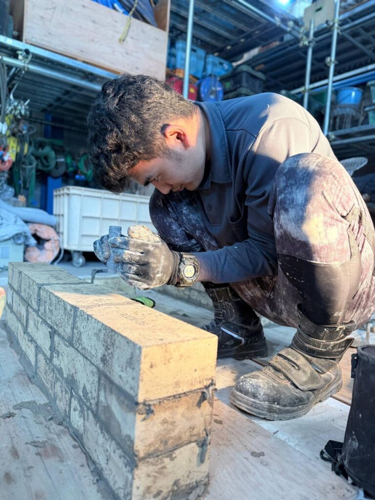 今回の講習では、レンガ積みの基礎精度、目地の均一性、墨出し、施工スピードと安全管理まで、試験を想定した実践形式で徹底的に訓練を行いました。